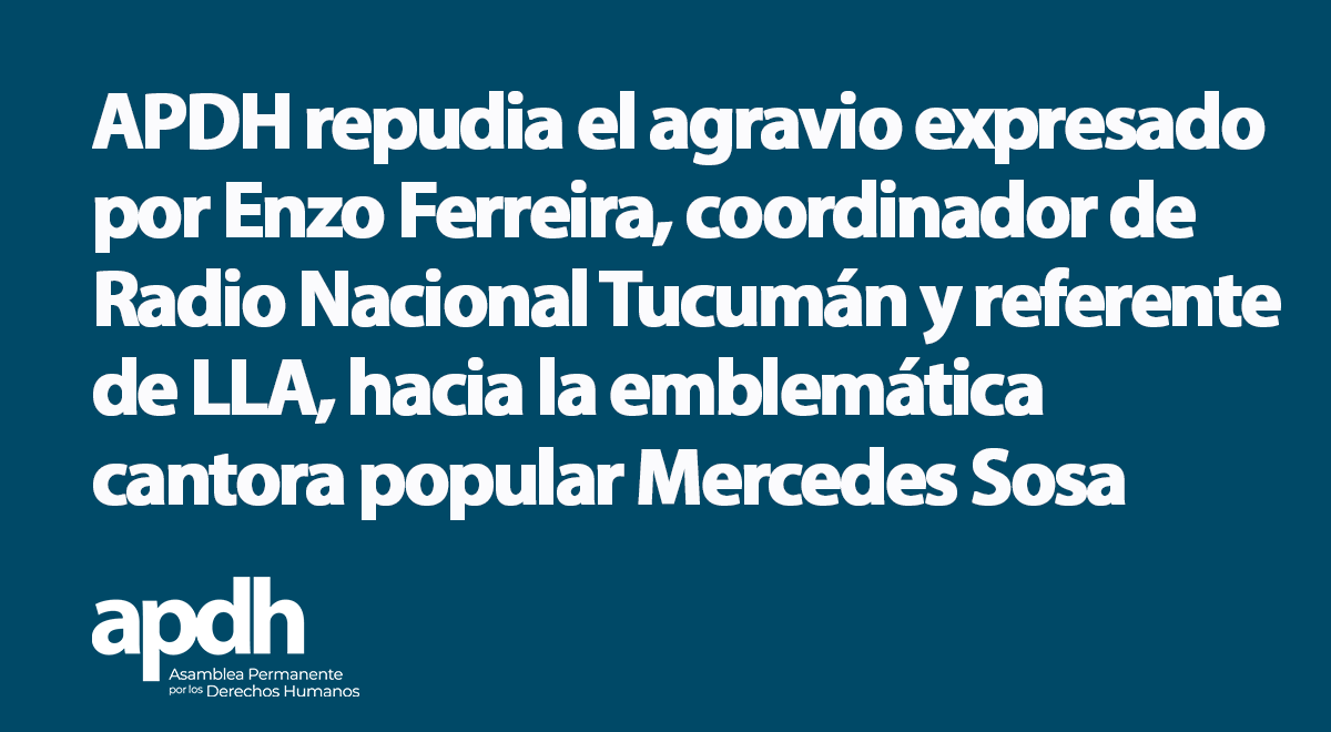 La Asamblea Permanente por los Derechos Humanos (APDH) repudia enérgicamente el reciente agravio expresado por Enzo Ferreira, coordinador de Radio Nacional Tucumán y referente del espacio político La Libertad Avanza, hacia la emblemática cantora popular Mercedes Sosa.