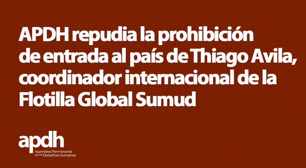 La APDH repudia la prohibición de entrada al país de Thiago Avila, coordinador internacional de la Flotilla Global Sumud. Como parte del movimiento internacional de solidaridad con el Pueblo Palestino, la APDH adhiere y acompaña la creación de la Global Sumud Argentina cuya presentación se hará hoy martes 31/3 a las 15 horas en la sede de ATE Capital (Carlos Calvo 1378, CABA).
