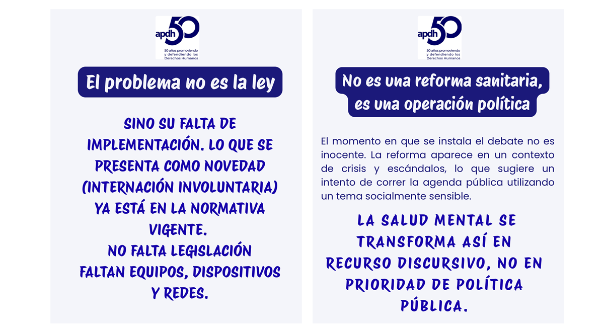 No a la reforma de la Ley Nacional de Salud Mental n掳 26657 14/04/2026 APDH Nacional 馃摙 No es la ley, es聽falta de Estado