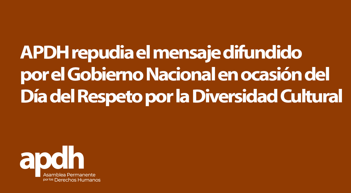 La Asamblea Permanente por los Derechos Humanos (APDH) expresa su enérgico repudio frente al mensaje difundido por el Gobierno Nacional en ocasión del Día del Respeto por la Diversidad Cultural, en el cual se exaltan las figuras coloniales y se menosprecia abiertamente a los pueblos originarios, reivindicando una visión eurocéntrica, racista y contraria a los principios fundamentales de los derechos humanos y del orden constitucional argentino.