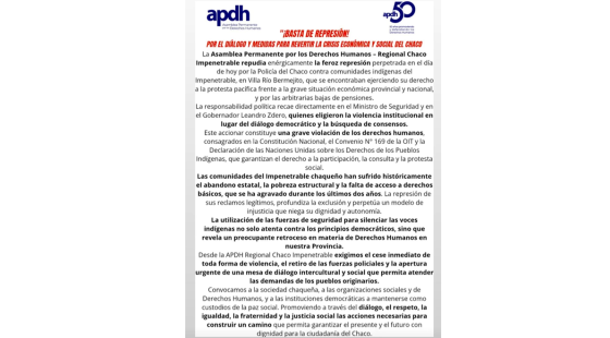 La Asamblea Permanente por los Derechos Humanos (APDH) expresa su enérgico repudio frente al mensaje difundido por el Gobierno Nacional en ocasión del Día del Respeto por la Diversidad Cultural, en el cual se exaltan las figuras coloniales y se menosprecia abiertamente
