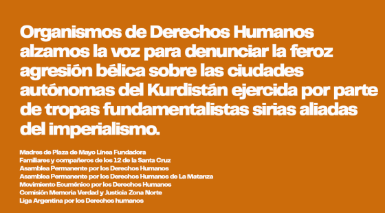 Los Organismos de Derechos Humanos de Argentina abajo firmantes alzamos nuestra voz para denunciar la feroz agresión bélica sobre las ciudades autónomas del Kurdistán ejercida por parte de tropas fundamentalistas sirias aliadas del imperialismo.
