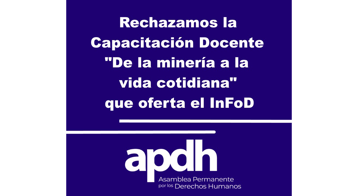 Ante la convocatoria a Capacitación Docente que realiza el INFOD (Instituto Nacional de Formación Docente) en conjunto con la Secretaría  de minería,  para el curso “De la minería a la vida cotidiana” y en base a la información que la página ofrece, la Asamblea Permanente por los Derechos Humanos manifiesta que: