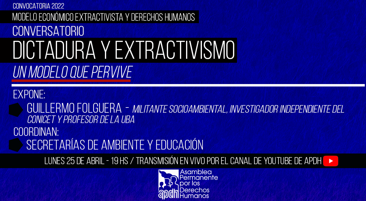 En el marco del relanzamiento de la Convocatoria del Proyecto “Modelo Económico Extractivista y Derechos Humanos”, la Asamblea Permanente por los Derechos Humanos (APDH) invita a participar del Conversatorio: “Dictadura y Extractivismo. Un modelo que pervive”.