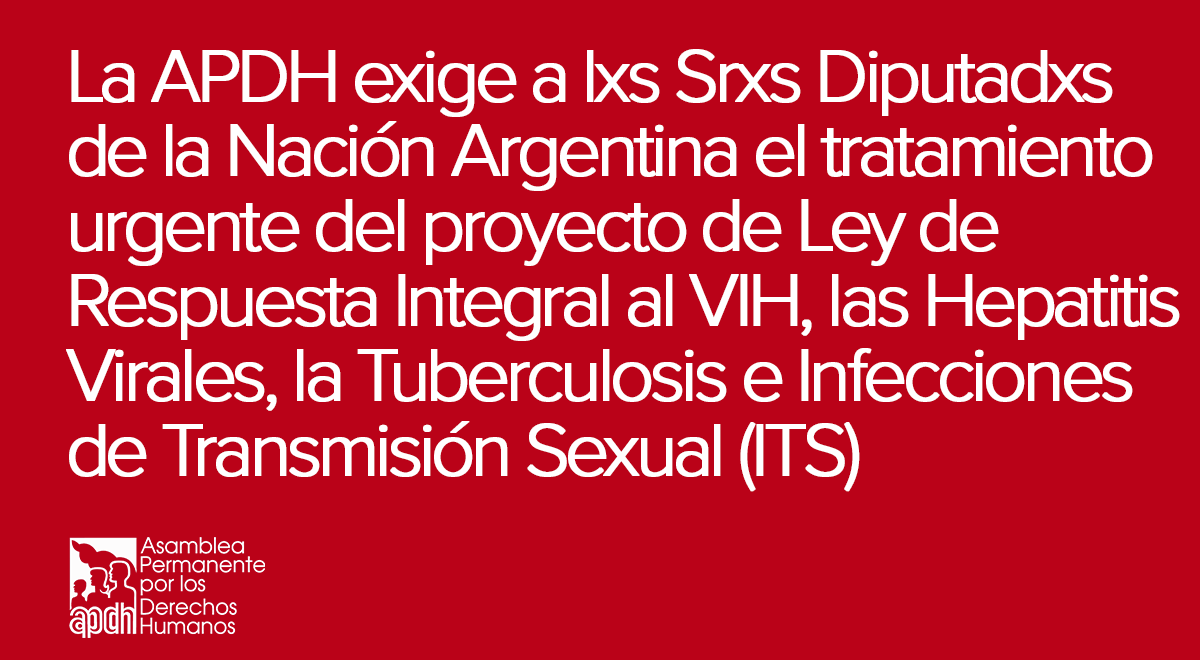 Por pedido de la Secretaría de Salud la APDH exige a lxs Srxs Diputadxs de la Nación Argentina el tratamiento urgente del proyecto de Ley de Respuesta Integral al VIH, las Hepatitis Virales, la Tuberculosis e Infecciones de Transmisión Sexual (ITS).