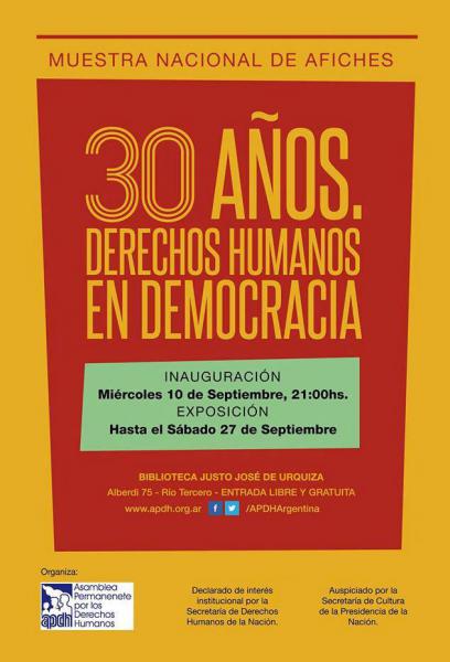 La Asamblea Permanente por los Derechos Humanos (A.P.D.H) – Delegación Río Tercero- invita a la inauguración de la Muestra Nacional de Afiches “30 años. Derechos Humanos en Democracia”, la cual se llevará a cabo el día miércoles 10 de septiembre, a las 21:00 horas, en la sede de la Biblioteca Popular Justo José de Urquiza.